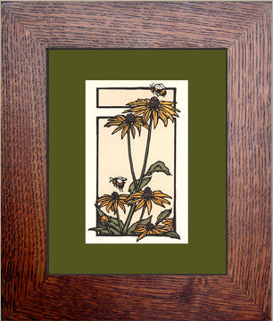 Our notecard frames are made by Dard Hunter Studios in Ohio, using quarter-sawn white oak. They feature mitered corners and a Craftsman Oak finish, with a Fern mat to complement the design.