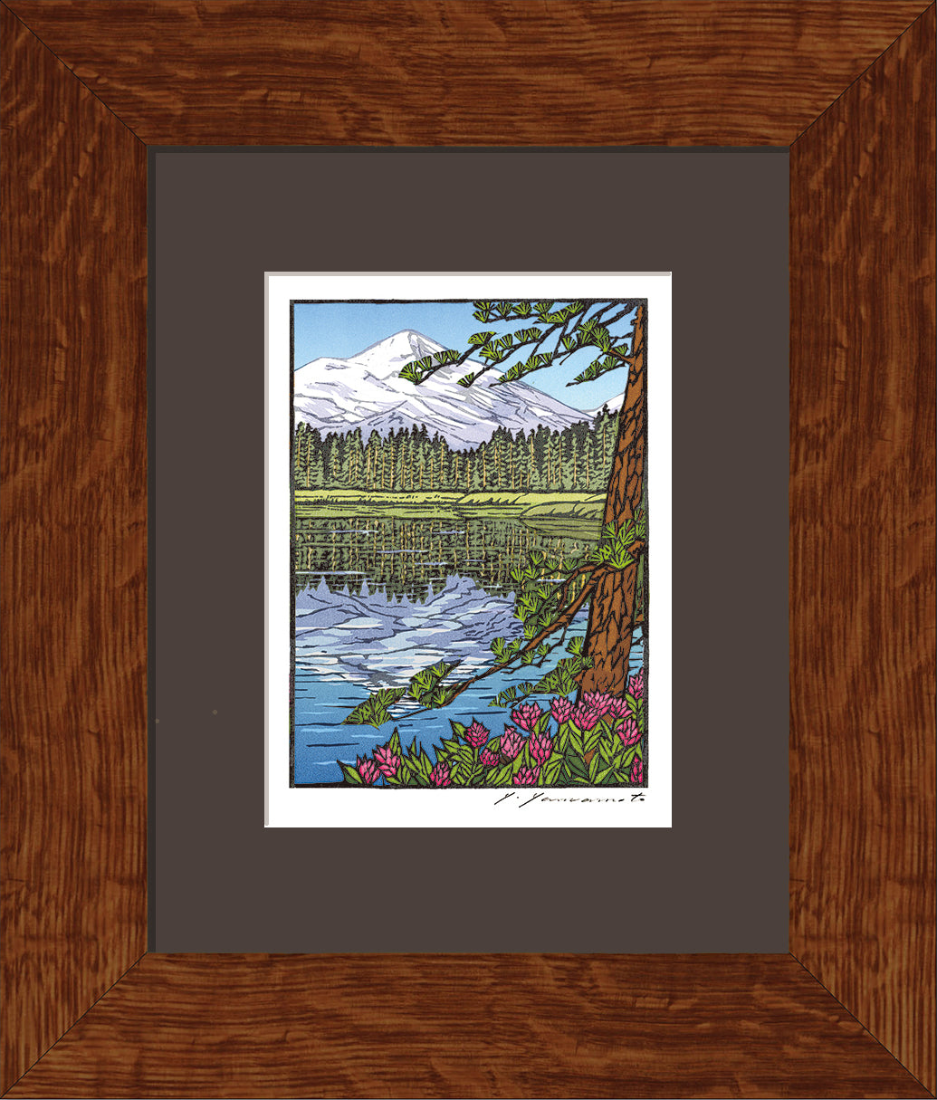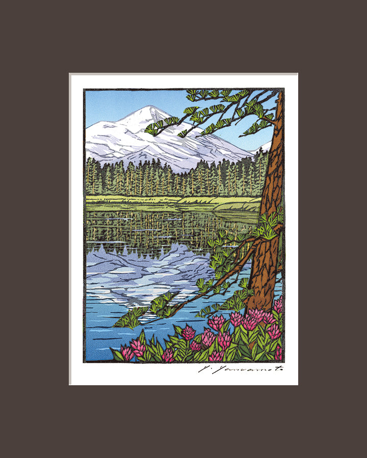 Enjoy this notecard designed by Yoshiko Yamamoto, perfect for displaying matted or matted/framed. This reproduction features a woodblock print of a peek-a-view image of Three Sisters Mountains in Central Oregon.