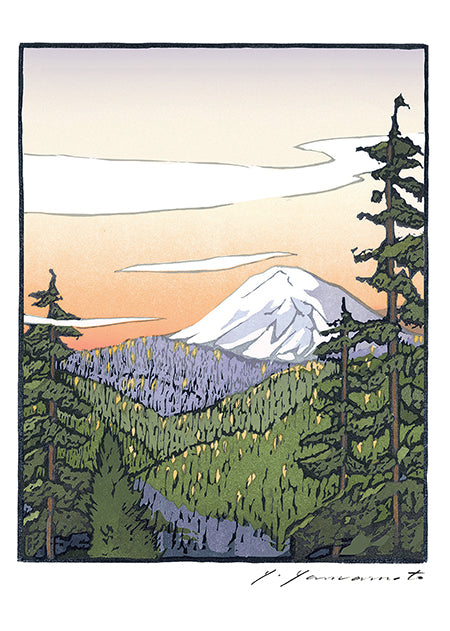 This reproduction image features a woodblock print image of Mt. Rainier during sunset.
